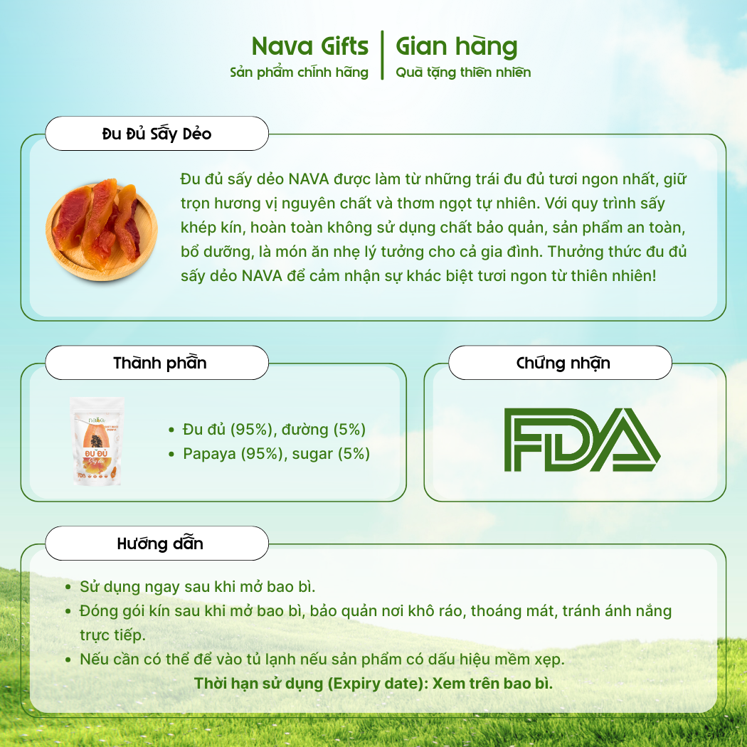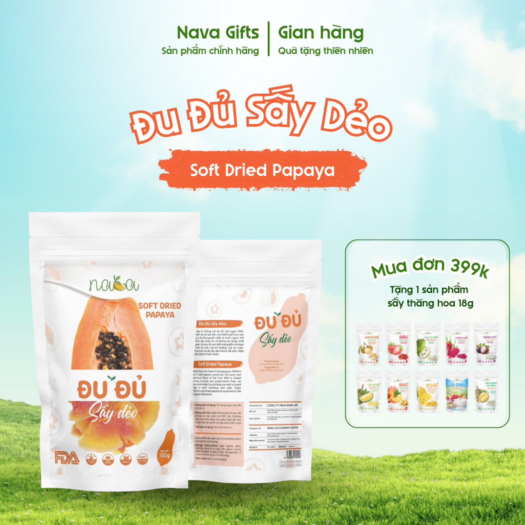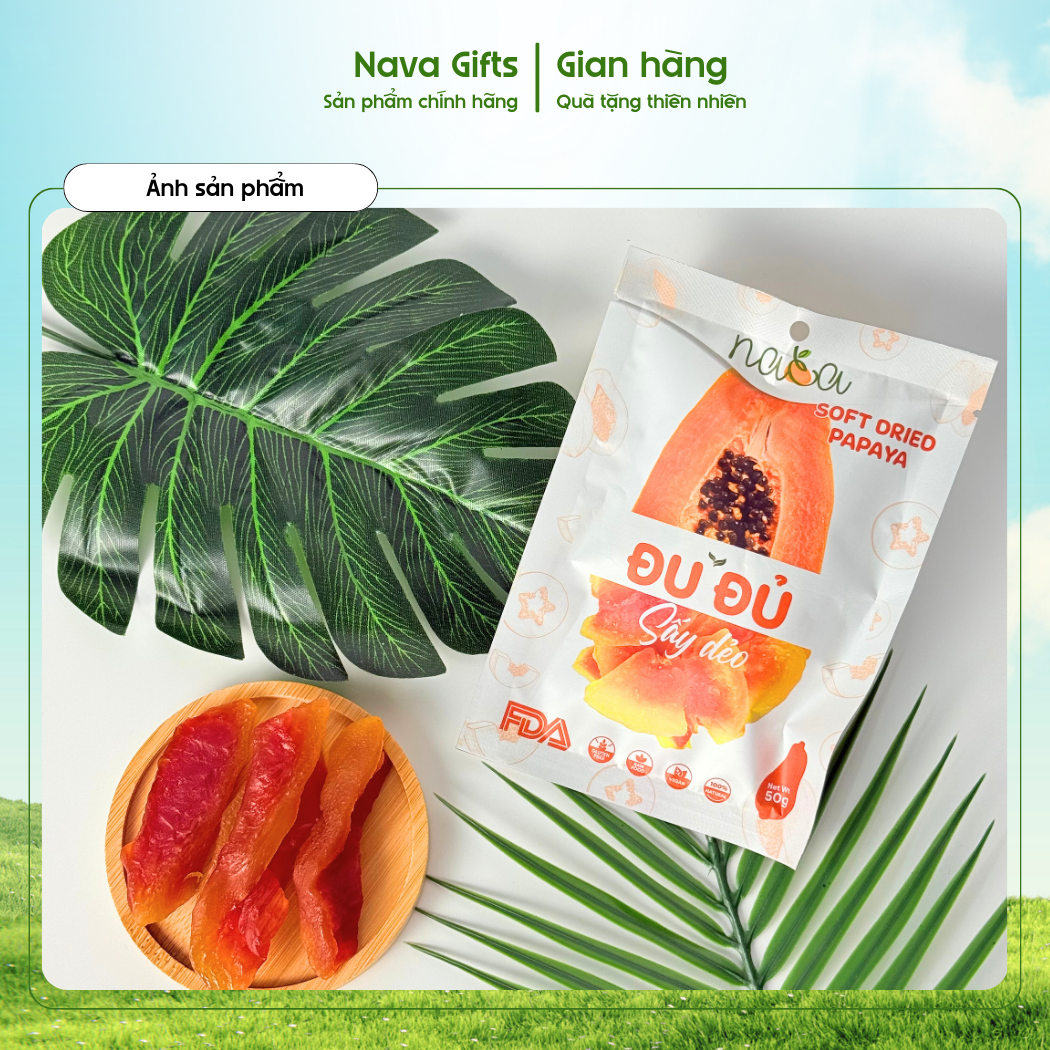 Được chế biến từ những trái đu đủ tươi chín đều, đu đủ sấy dẻo NAVA mang đến hương vị nguyên bản thơm ngon, ngọt nhẹ và mềm dẻo tự nhiên. Nhờ áp dụng quy trình sấy khép kín hiện đại, không sử dụng chất bảo quản, sản phẩm giữ được tối đa dưỡng chất và độ an toàn cho sức khỏe người dùng.
