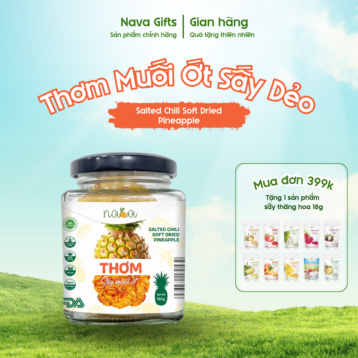 Thơm sấy dẻo muối ớt NAVA – phiên bản hũ thủy tinh 180g – được chế biến từ những trái thơm chín vàng được lựa chọn kỹ lưỡng từ các nhà vườn. Qua công nghệ sấy dẻo hiện đại và quy trình khép kín, sản phẩm giữ được hương thơm tươi mát tự nhiên cùng kết cấu dẻo mềm hấp dẫn.
