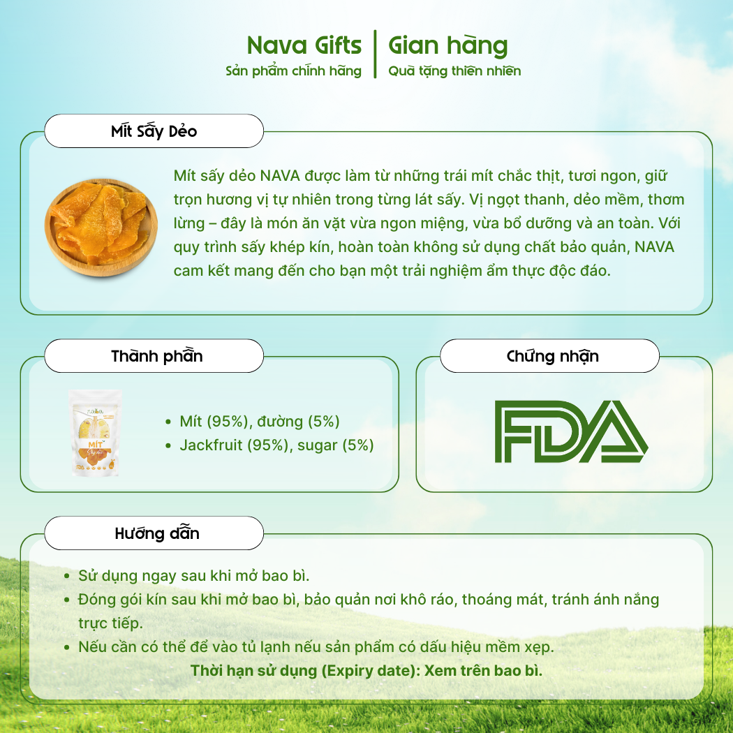 Được chế biến từ những trái mít chín cây, chắc thịt và thơm ngọt, sản phẩm mít sấy dẻo NAVA mang đến hương vị nguyên bản đặc trưng, kết hợp cùng độ dẻo mềm tự nhiên, ngọt thanh và hấp dẫn trong từng lát. Với công nghệ sấy hiện đại trong quy trình khép kín, sản phẩm được bảo quản an toàn mà không sử dụng bất kỳ chất bảo quản nào.