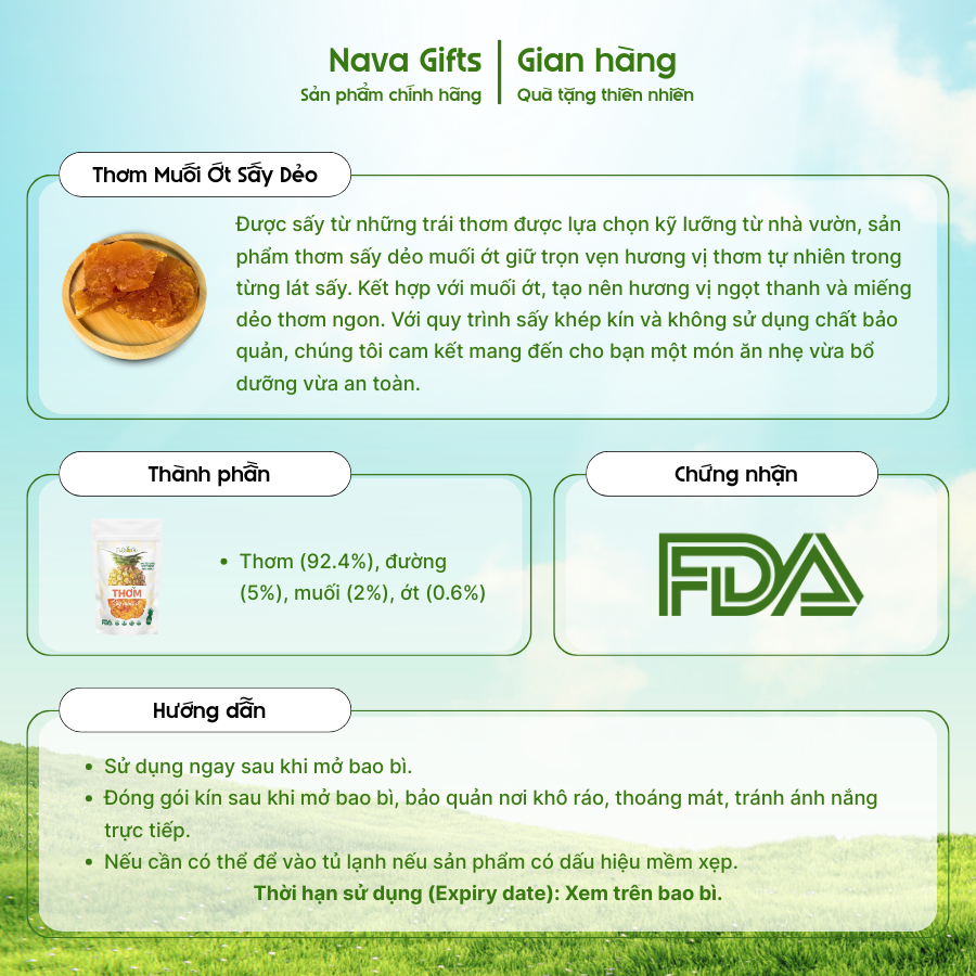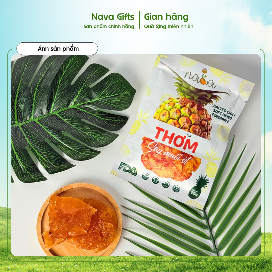Thơm sấy dẻo muối ớt NAVA được chế biến từ những trái thơm chín vàng được tuyển chọn kỹ lưỡng tại các nhà vườn uy tín. Nhờ áp dụng công nghệ sấy dẻo hiện đại trong quy trình khép kín, sản phẩm giữ nguyên được hương vị thơm mát tự nhiên và kết cấu dẻo mềm hấp dẫn.