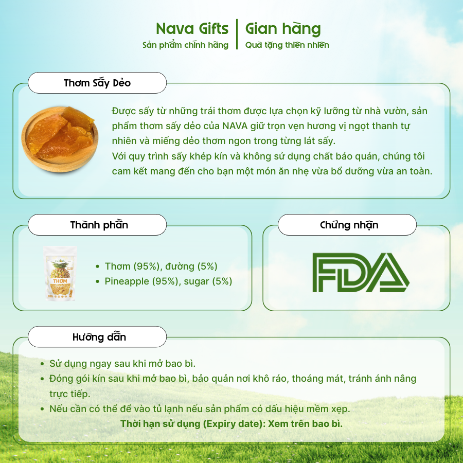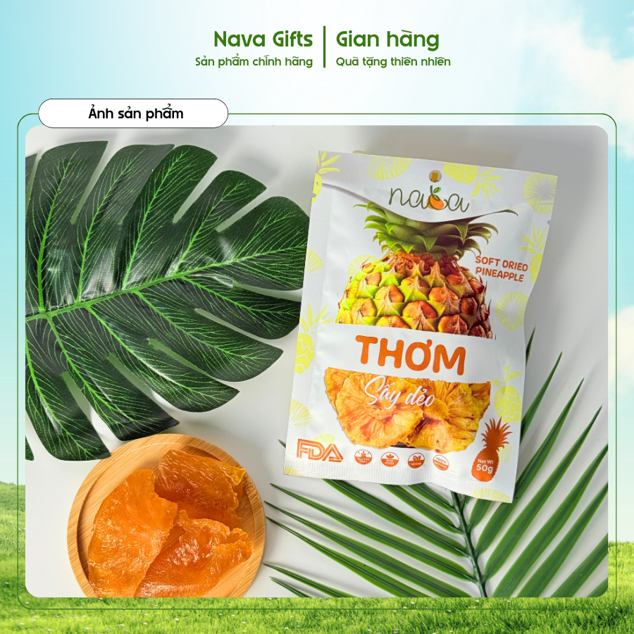 Thơm sấy dẻo NAVA được chế biến từ những trái thơm chín vàng, tuyển chọn kỹ lưỡng từ các nhà vườn đạt tiêu chuẩn. Nhờ áp dụng công nghệ sấy dẻo hiện đại trong quy trình khép kín, sản phẩm giữ trọn hương vị ngọt thanh tự nhiên, kết cấu dẻo mềm, thơm ngon trong từng lát.